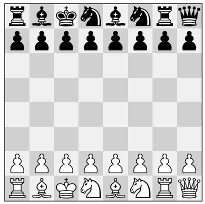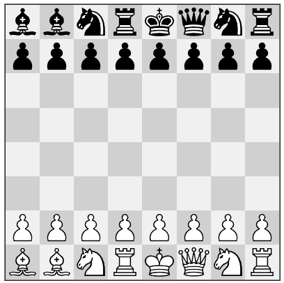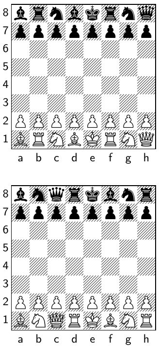 Figura 4: Duas configurações corretas de chess960 obtidas com o pacote xskak para \(\LaTeX{}\).
